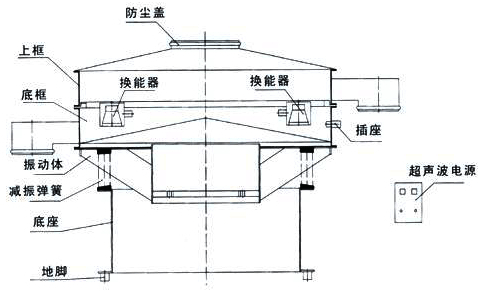 超聲波振動篩,由立式振動電機軸的上下兩端的偏心重錘產生振動源,使超聲波振動篩參振的上部在水平、垂直、傾斜方向做三次元運動,調節上、下部重錘的相位角,可改變物料在篩面上各種不同的運動軌跡,來滿足各種不同比重物料的很好篩分或過濾,增減上、下部重錘附加重塊的數量,會產生不同的振動力,可以達到不同比重、不同目數(或孔徑)物料的很好篩分、過濾效果。